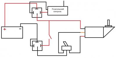 Нашел дома рабочий блок и пульт от р/у машинки, пока хочу его добавить в схему электропитания ч-з размыкающее реле, т.е. пока я не трогаю пульт, ребенок спокойно едет куда хочет, но как только я нажму на кнопку - питание отключится и машинка остановится: