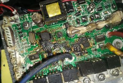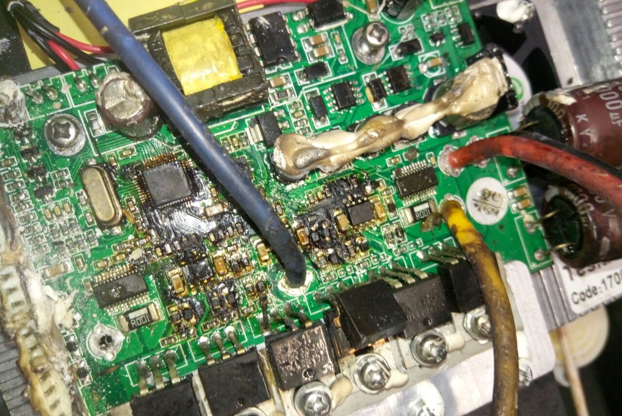Ну а так, самостоятельно открываем и осматриваем внутренности. Дымить могли провода, может батарея или еще какой нибудь полимер. Если в выключенном состоянии колесо вращается туго, то так же придется чинить/менять контроллер.