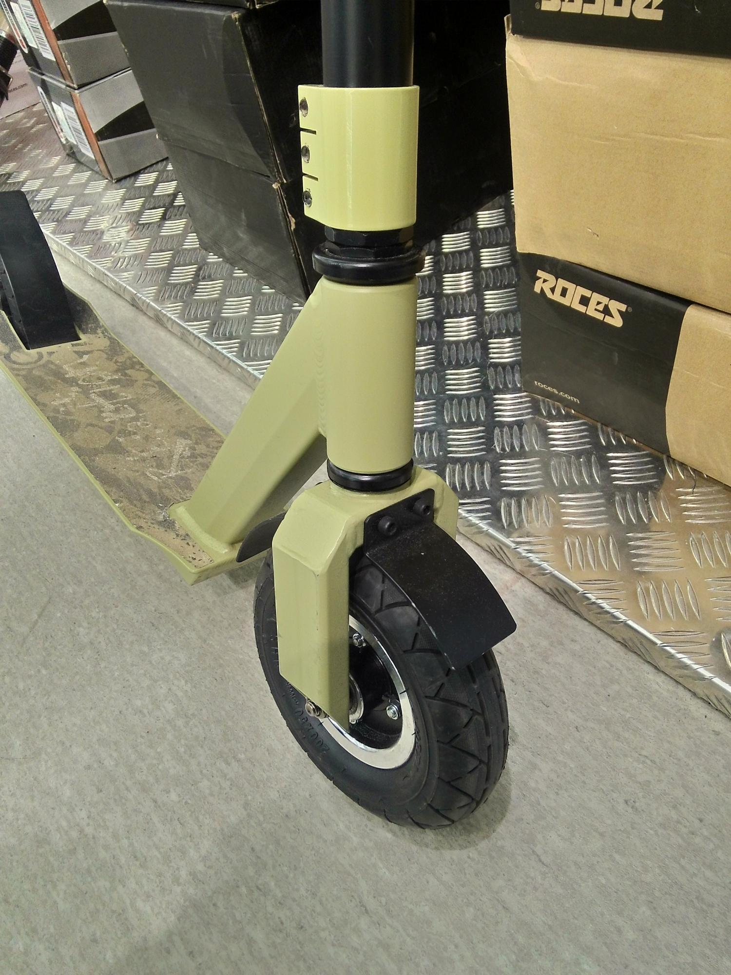 Из интересного передняя вилка и покрышка на МК. Вилка пока очень нравиться, мягкая, пружинистая, ничего не бренчит, не стучит. На бордюры запрыгивать одно удовольстие: толкнул руль вниз и на отдаче заскочил. Резину на МК поменял, т.к. стоковая была просто дубовая, даже надписи Risingsun не было, как на etwow. Дырявая конечно помягче. Если все равно будет жестковато, то буду 10'' пневму одевать (как у [user]васисуалий[/user]) или еще есть мысль сделать рессоры ([user]кот ленивый[/user] это реально на такой деке?)