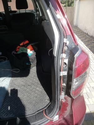Во-первых, через месяц такого варварства на скорости около 30 км/ч скотч все-таки порвался, панельку сорвало с крыши и неслабо шибануло о корпус авто, в результате по ней пошли трещины (видны на фото) и внутри поломались проводники. Пришлось расковыривать покрытие сзади, искать эти проводники, соединять их, опять все заделывать... Работает, несмотря на трещины, вроде также как и раньше.