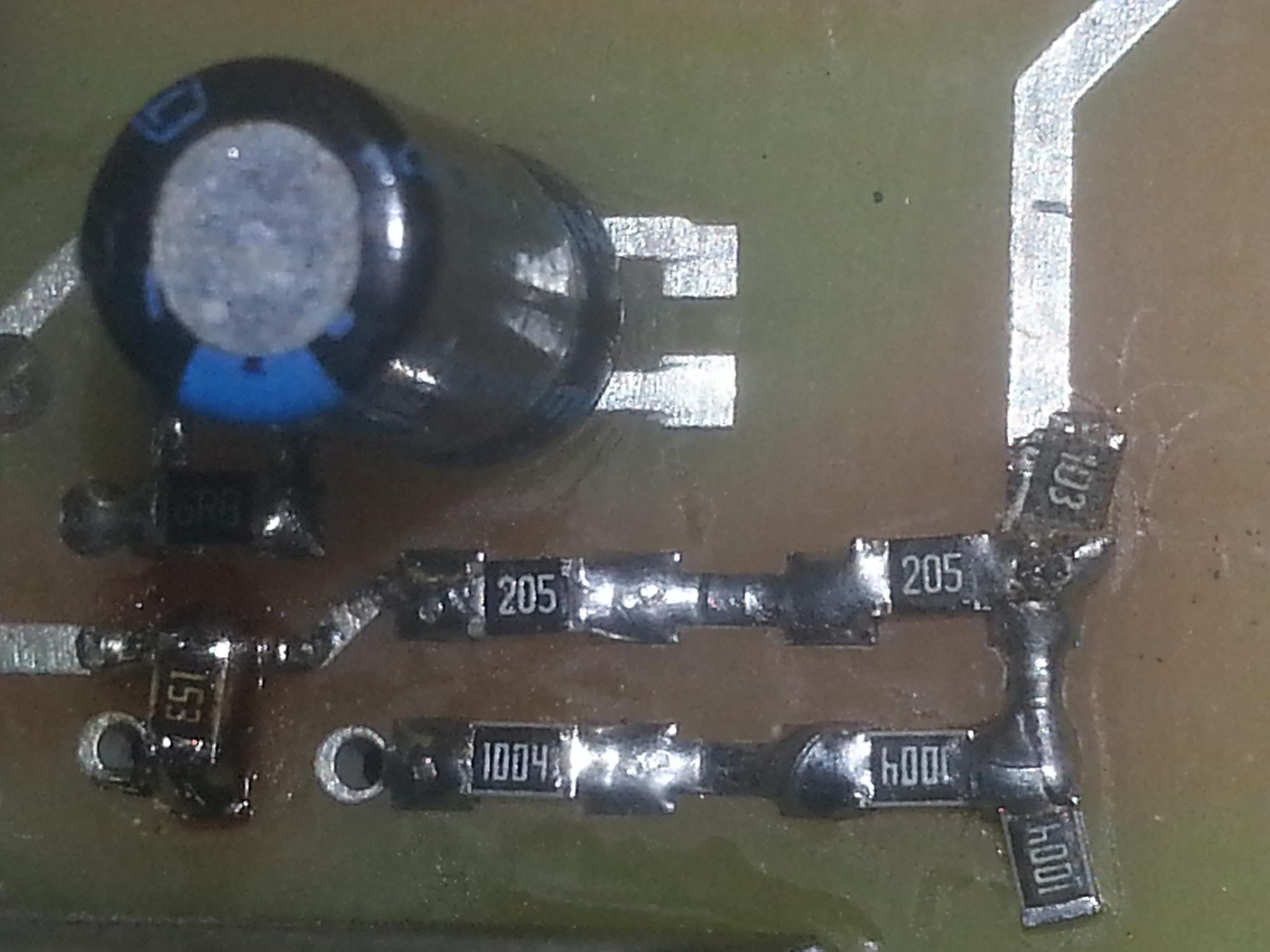 2.Еще цепочка из резисторов 1МОм, у нас они последовательно соеденены, но сверху одного припаян еще оди в параллель вот его мы и снимаем, он у меня всторонке справа. В итоге должна получиться цепочка из двух резисторов, как видно нс фото.
