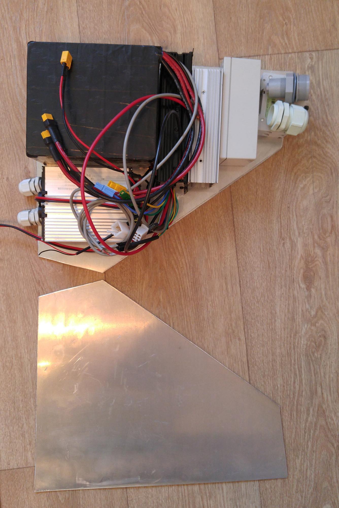 DC-DC, плату управлением включения и кнопку питания установил в небольшой алюминиевый корпус под пластиной (видно на первом фото). В этот же корпус установлен второй DC-DC на 7,2В - для питания фары.