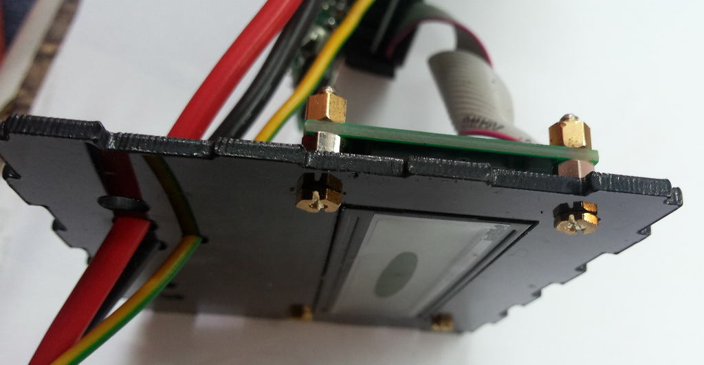 Дисплей закреплён на стойках высотой 5мм. Это как раз "та самая" высота, при которой дисплей стоит вровень с лицевой панелью.) Можно использовать вместо стоек проставки на 5мм.
