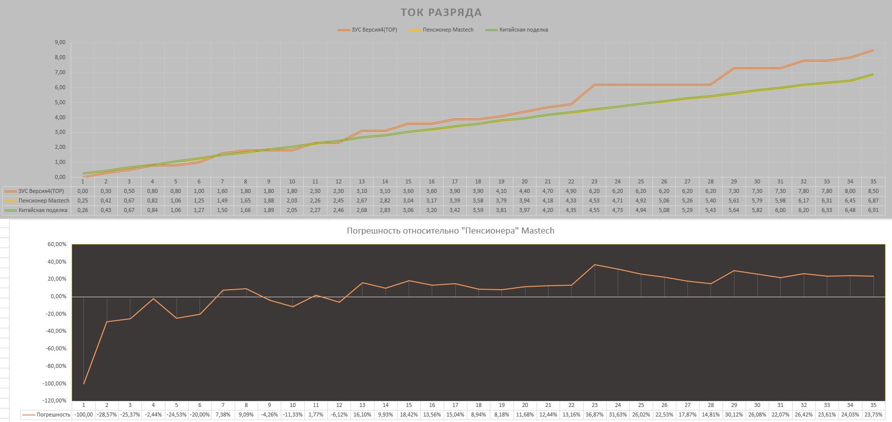 Ну и результаты (погрешность показаний ЗУСа считал от показаний мультиметра-пенсионера):
