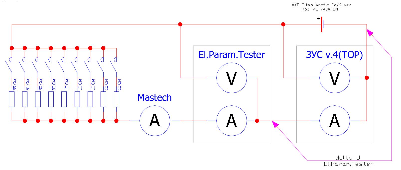 Так как аккумулятор под рукой, решил "прогнать" ЗУС по более широкому диапазону разрядных токов. Собрал из имеющихся резисторов и выключателей схемку, в цепь дополнительно ещё подключил "Китайскую поделку". Китайский производитель заявляет погрешность измерения тока +/-(1%+2digits), но при отсутствии тока "поделка" кажет ток 0,01А  :laugh: