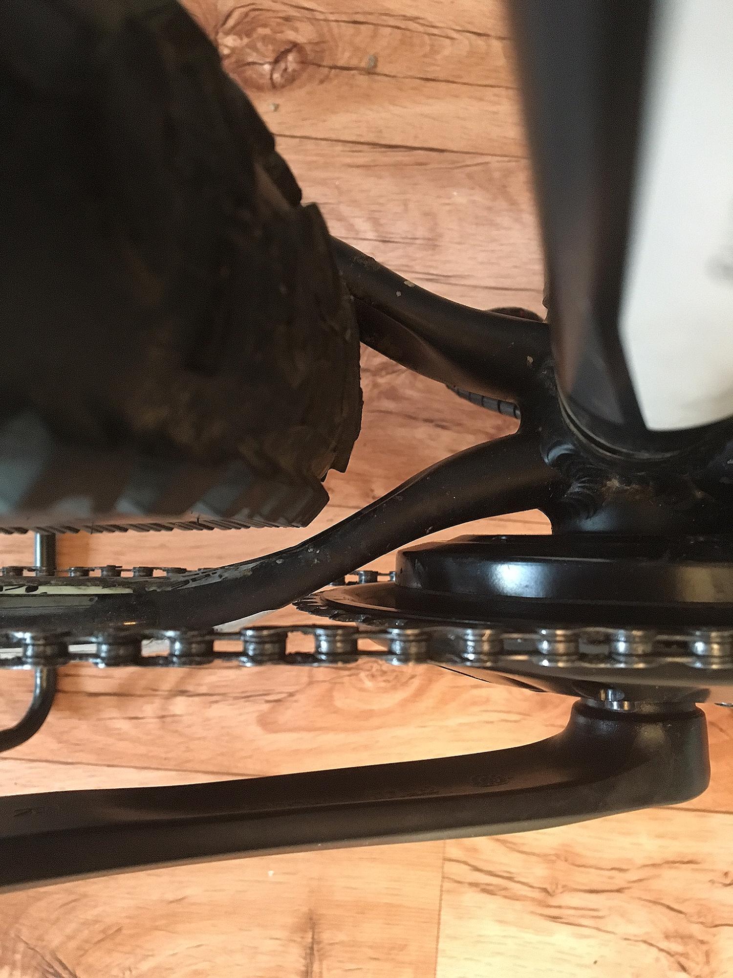 В итоге справа между покрышкой и рамой зазор в 6 мм, а слева 0 мм.