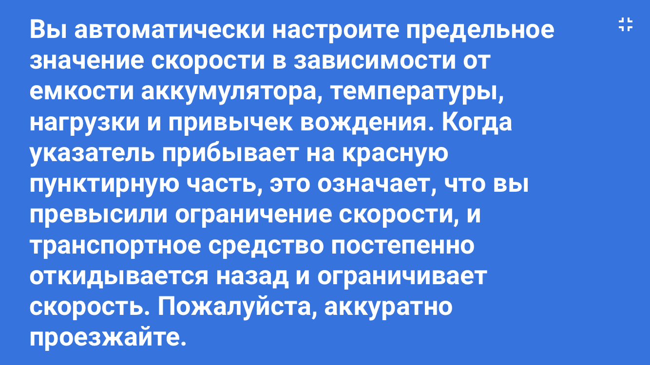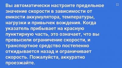 Судя по скриншоту, остаток батареи ниже 40%, и в этом случае, максимальная скорость всегда снижается до 16,5 км/ч. Ну, и соответственно, чем меньше остаётся заряда, тем меньше будет максимальная скорость. При превышении скорости или слишком агрессивных разгонах, максимальная скорость также будет снижаться по чуть-чуть, даже при полностью заряженной батарее, но в случае "штрафов", максимальная скорость возвращается к норме, через некоторое время спокойной езды.