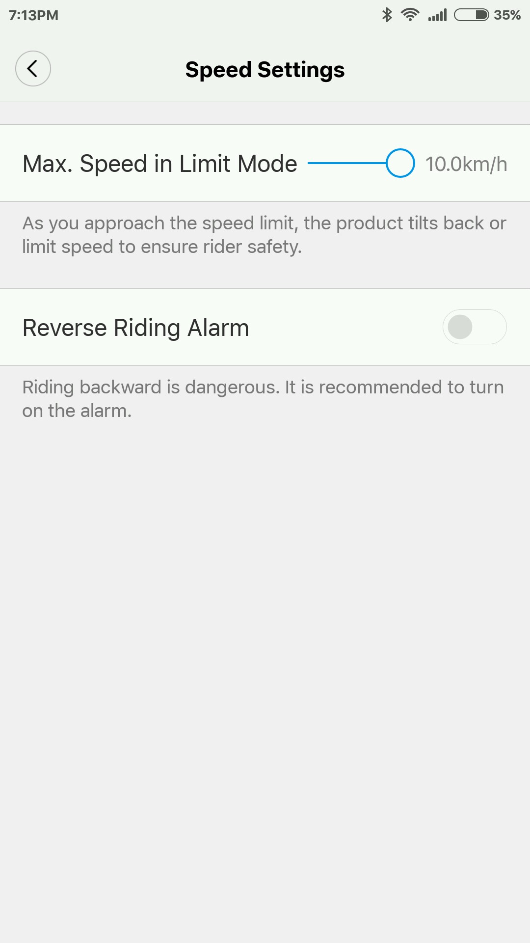Зарегистрировались в приложении (по почте @mail.ru, без ввода телефона), прошли обучение, накатали 30 км а ограничение в 10 км/ч так и не снимается. Кнопку limit off жали, толку нет.