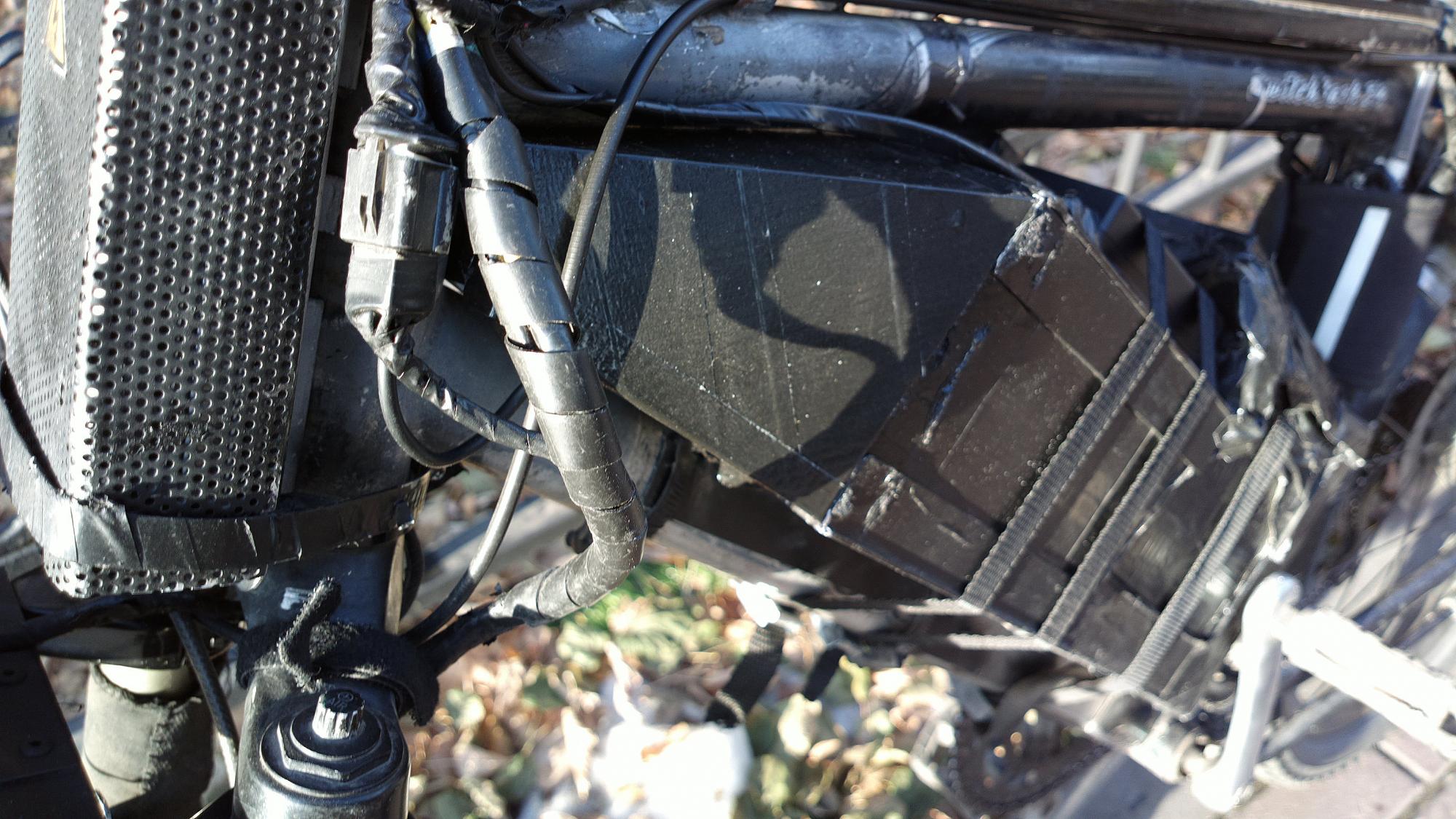 Раньше, на переднем приводе, только мои 200 Вт крутили колесо, сейчас к ним прибавилось ещё 1000 Вт мотора. Я привыкший крутить педали в помощь переднему МК, просто не почувствовал, что колесо клинит грязью. На МАСе такого не было - раздельный привод.