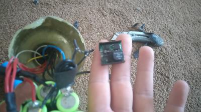 посути внутри оказалось 30 батареек подключенных последовательно но от + и - этой гирлянды шло не по 1 проводку а целая куча. Прямо на месте я отсоеденил + и - в этой бутылке от не рабочех АКБ и подсоеденил к своему акамулятору. Но при попытке Влючить мотор, в этой бутылке взорвался конденсатор на этой плате
