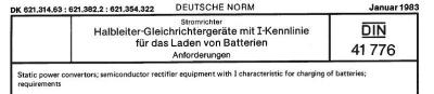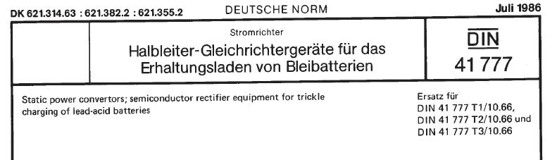 Им (и всем остальным) в помощь некоторые немецкие стандарты о требованиях к устройствам для заряда свинцово-кислотных батарей (само собой на немецком языке, название продублировано на английском) - то, что идет под аббревиатурой DIN: