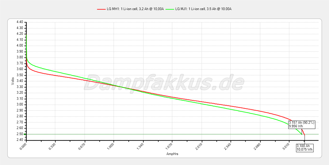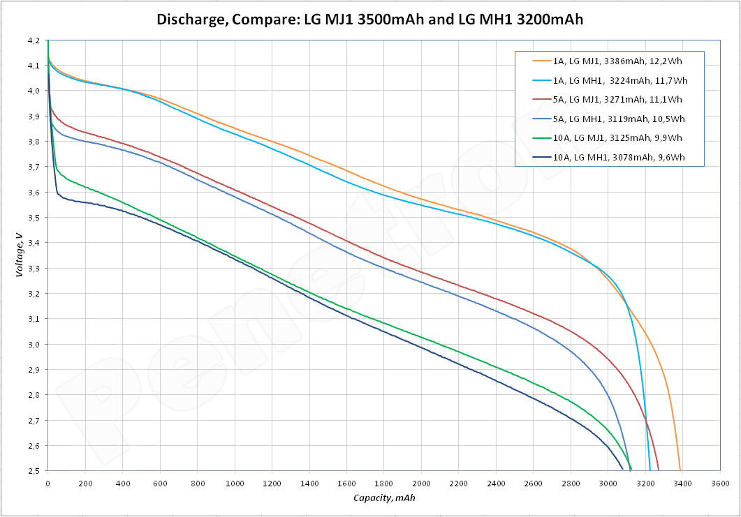 ЦитироватьНа низких токах при разрядке до 3.1V, аккумуляторы мало чем отличаются, но при дальнейшей разрядке LG MН1 сдаётся раньше LG MJ1. На средних токах LG MH1 отстаёт, как положено его ёмкости. При токе 10A, LG MJ1 на старте выглядит более уверенно, в остальном аккумуляторы отличаются не сильно. LG MH1 ведёт себя очень достойно, отдавая при такой нагрузке всего лишь на 100mAh меньше заявленной ёмкости, LG MJ1 отдаёт на 300mAh меньше при тех же условиях.