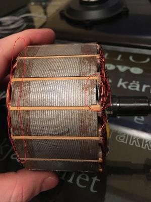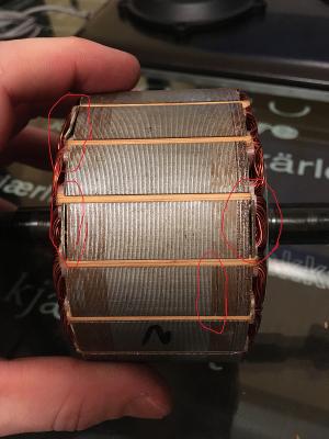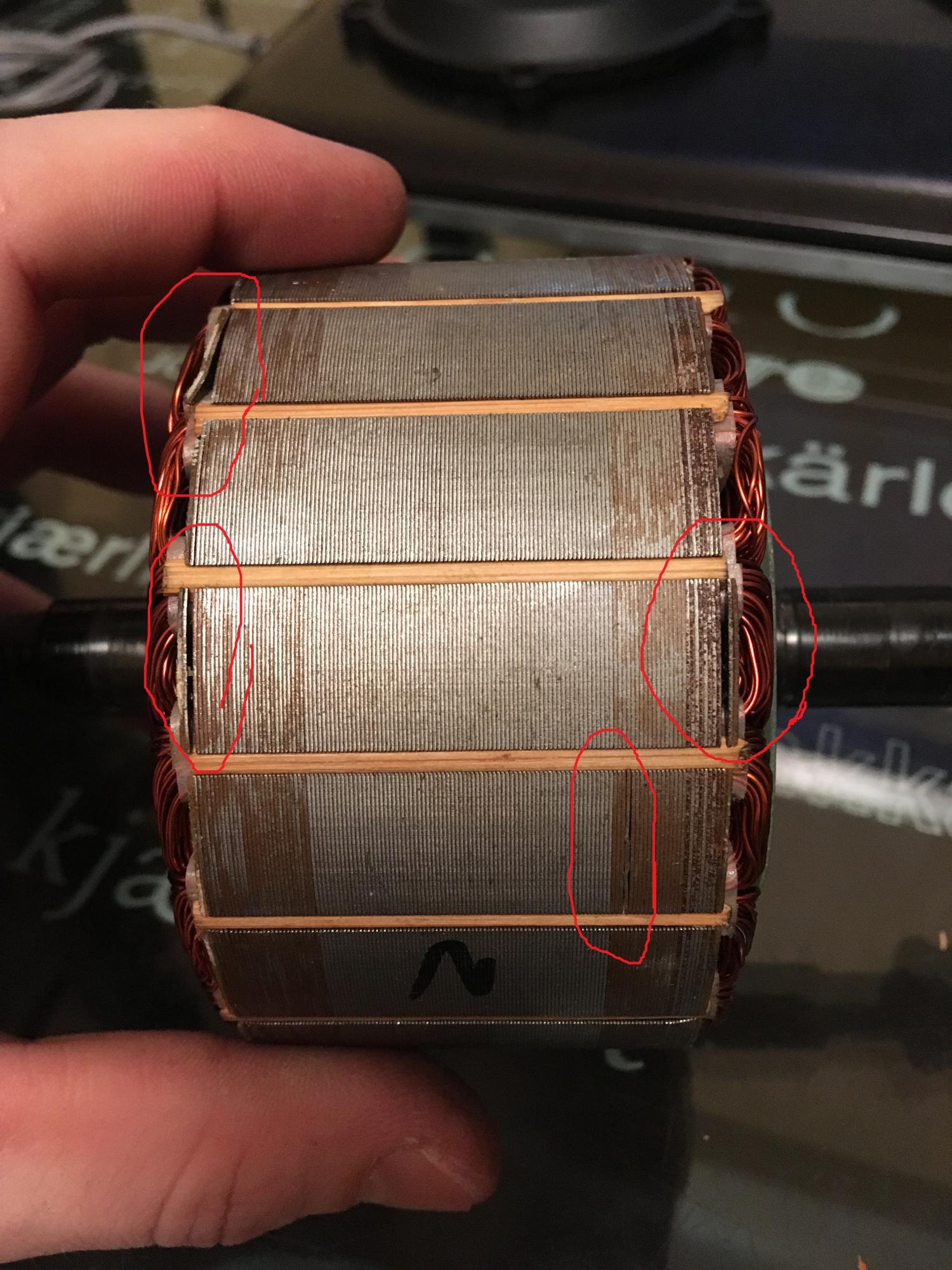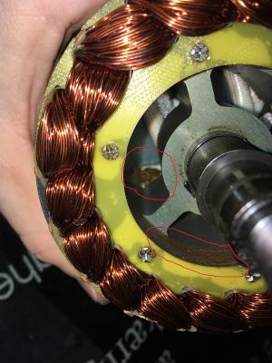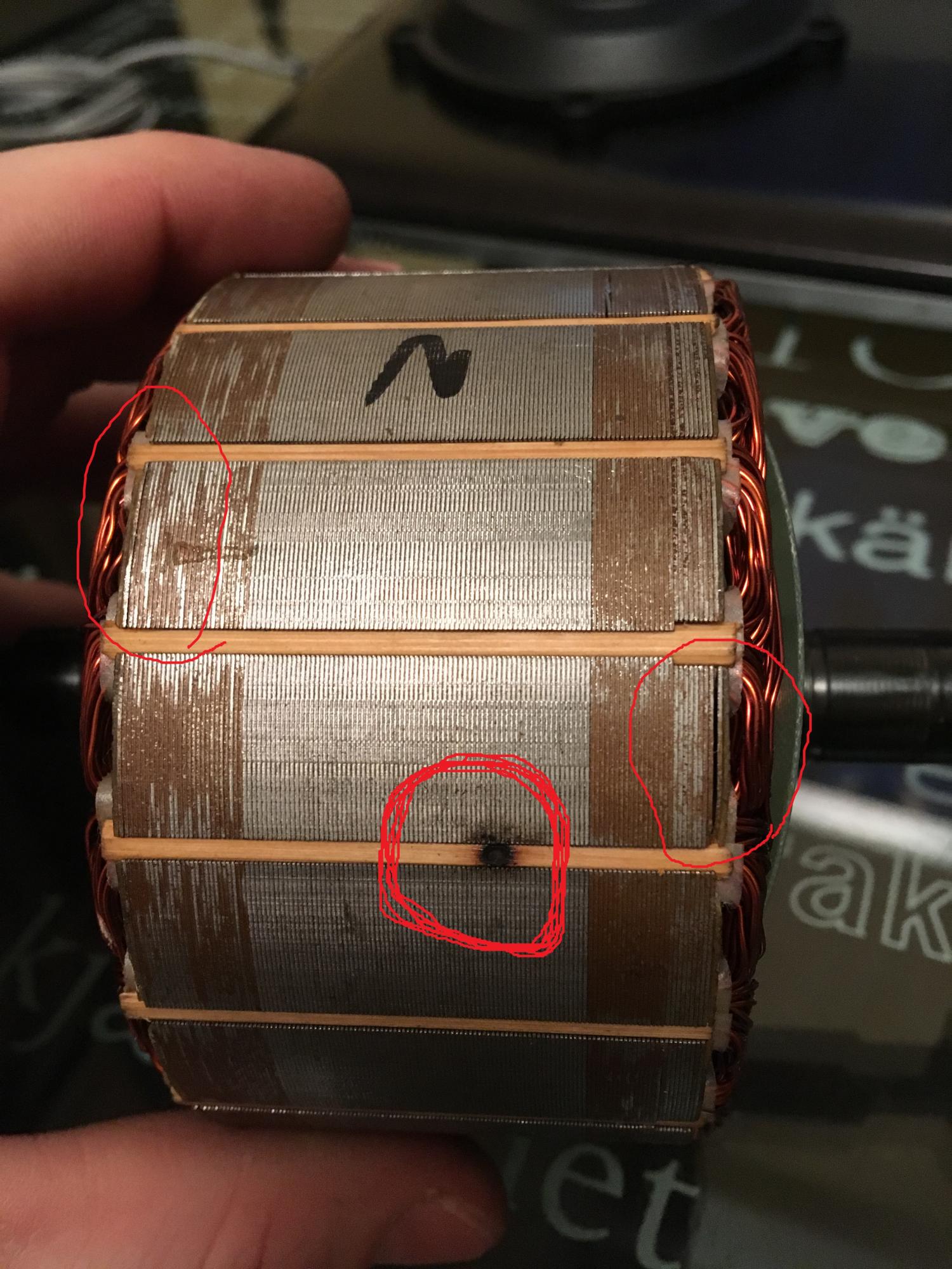 На деревянном изоляторе прогар, ротор в лаке, статор не пролачен, весь ржавый, пластины отходят, чертят об крышку. С внутренней стороны статора большой комок лака лежал.