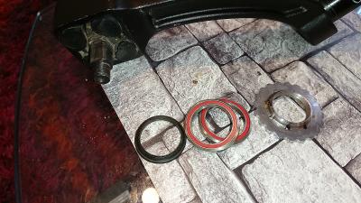 Самая первая деталь, которая одевается на "вилку" (та часть, которая вставляется в рулевой стакан снизу) - конусное опорное кольцо.
