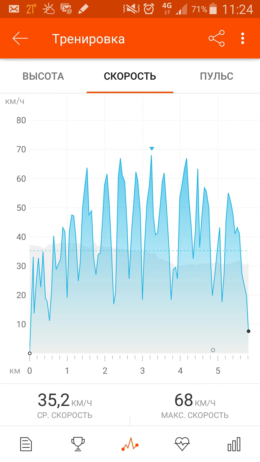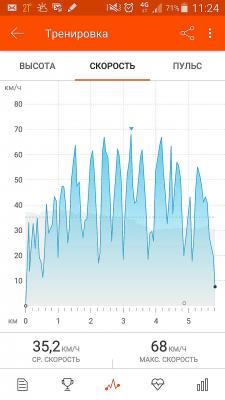 М.б. просто прога не фиксировала моментальную максимальную скорость. Дисплей до 74 км/ч показывал, а в проге достичь 70 пока никак. Поменял endomondo на strava: