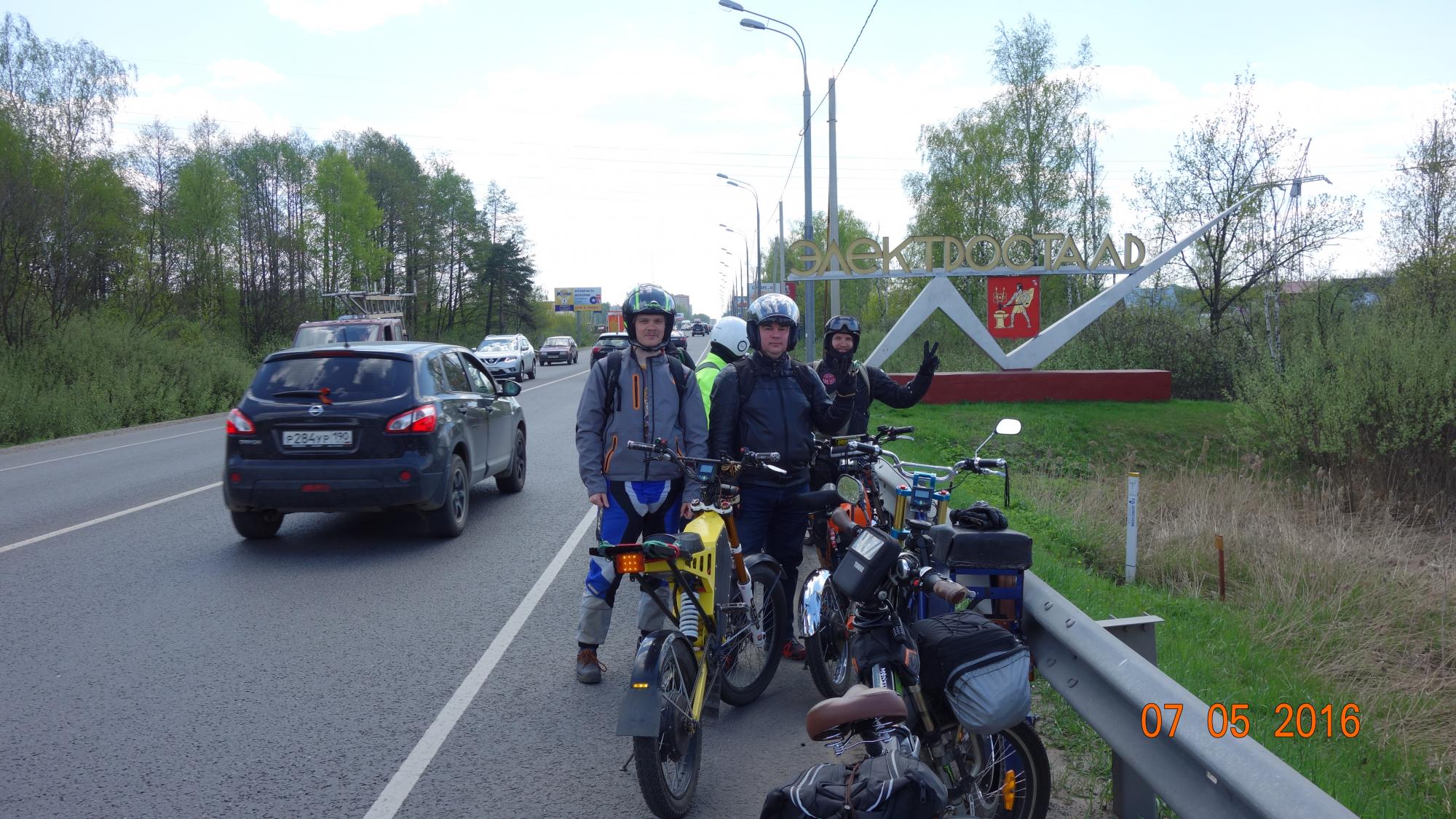 Далее с небольшим опозданием стартовали впятером. Пока ехали по Щелковскому шоссе до МКАД, было много светофоров, поэтому Леонид практически не отставал, старался держать скорость 40км/ч, усиленно педалируя. Проехали МКАД и встретились с Евгением [user]jora10rus[/user]. Затем уже вшестером проехав через Балашиху выехали на Горьковское шоссе и встретились с Сергеем [user]KuD1974[/user]. Далее еще долго продолжались послезвучия балашихинской пробки, поэтому проехали около 20км со скоростью 25-40км/ч, глотая пыль от коробочников, которые временами пытались объехать справа по обочине, и сделали остановку типа "булки размять / воды попить". Неожиданно во время остановки Сергей [user]KuD1974[/user] обнаружил, что у него потух Max-E. После непродолжительных манипуляций с проводами и тестером был сделан вывод, что популярнейший контроллер сдох в очередной раз на ровном месте без веских на то причин. Договорились с Сергеем, что он сам доберется обратно до дома, благо, что недалеко от Балашихи это случилось. Далее мы продолжили намеченный путь, к сожалению, без Сергея. Через некоторое время Сергей прислал уже из дома сообщение, что его с байком забрал друг на авто. До Электростали мне приходилось удерживать уже привычную скорость 40км/ч, регулярно поглядывая в зеркало на предмет отставания членов группы. С небольшим отставанием от намеченного графика мы прибыли в Электросталь на заправку Лукойл, где нас уже ждал Александр [user]AlexSmith[/user], который к тому времени уже успел там зарядиться.