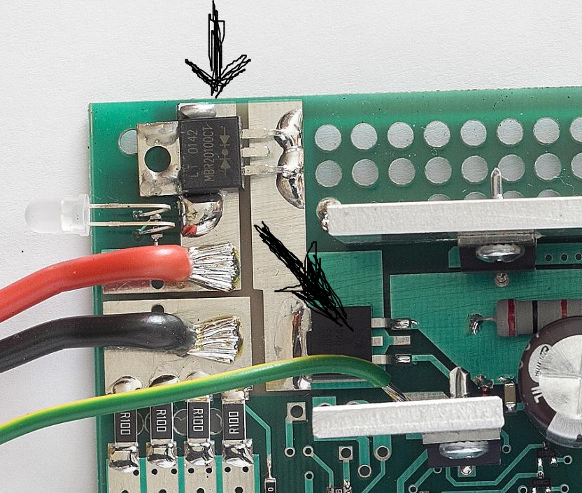 6. Замена установленной диодной сборки на выходе ЗУ после мосфета irf4905 - mbr20100 на mbr2045 для снижения тепловыделения.
