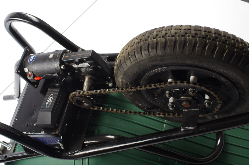 Мощности хватает чтобы уверенно тянуть груженую тачку по ровной поверхности и с небольшой подмогой в горочку. Скорость при применении 7 вольтового аккума получилась на уровне неторопливого пешего хода (А я обычно никуда и не тороплюсь).
