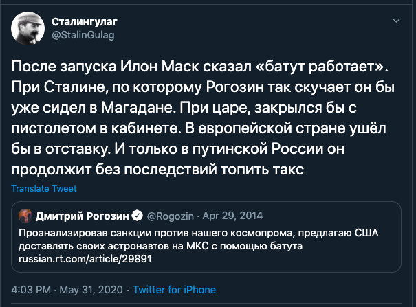 Рискну предположить, что и Рогозин и хозяева Кремля не сильно расстроились по поводу успешного запуска нового американского пилотируемого корабля.