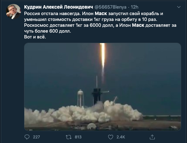 Рогозин с компанией может еще десятилетиями пилить наши налоги в огромных масштабах, и на строительстве космодромов и на освящении нелетающих ракет. При этом, как рассказал Навальный, бывший журналист построил себе огромный дом, лучше, чем у миллиардера Маска  B-)