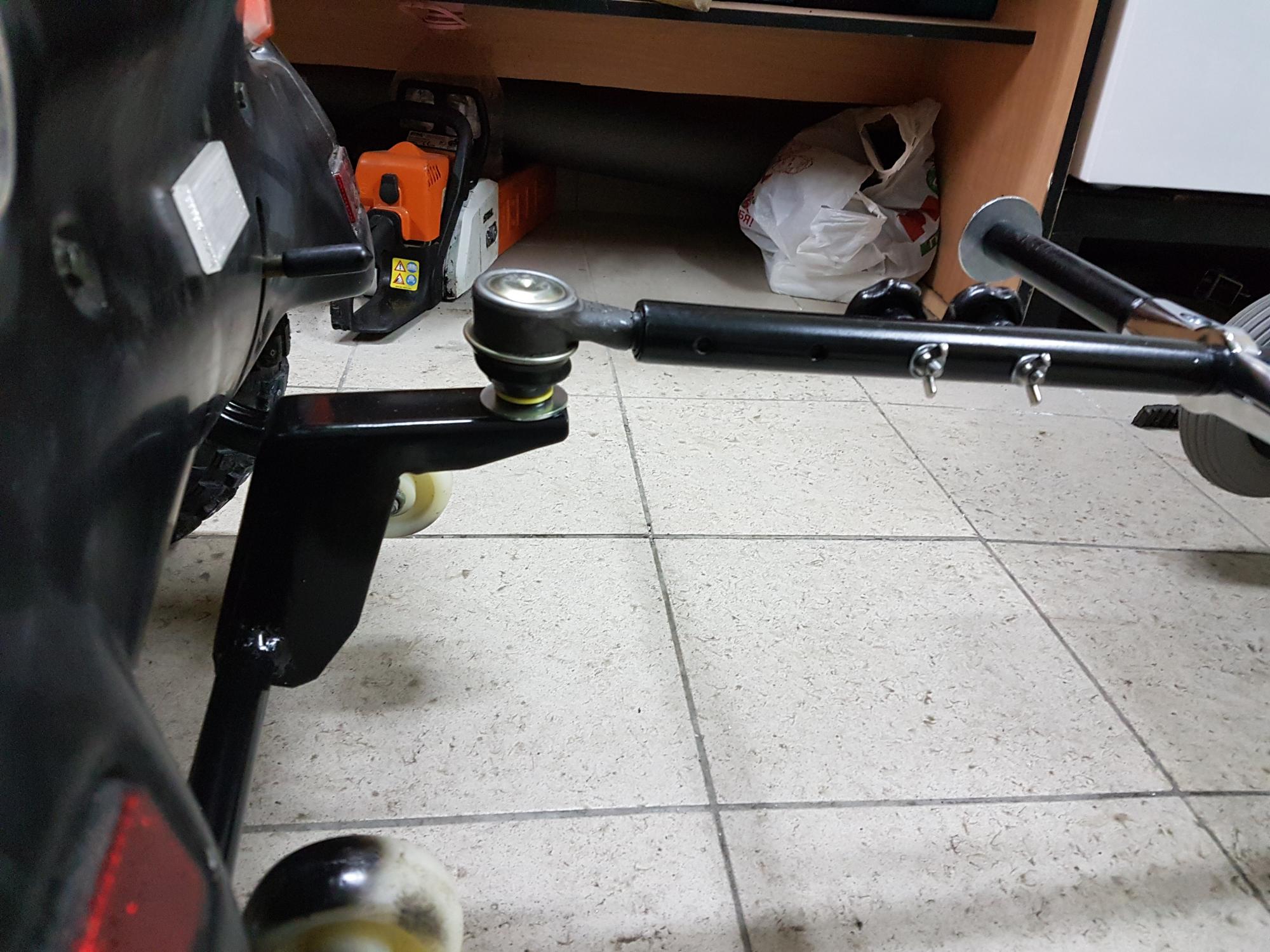 Сам "фаркоп" в данном варианте сделал из наконечника рулевой тяги, один болт которой прикручен к фаркопной площадке, другой за два шплинта закреплен внутри дышла и при необходимости может выдвигаться до 10см. Ну и отцепляется дышло тем же макаром. Наконечник рулевой тяги остается на скутере и отворачивается в бок( не очень эстетично, но не мешает). При необходимости снять - от него откручивается гайка. На полную сборку "прицепа-рикши" уходит около 10 мин. не торопясь.