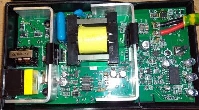 Корпус достаточно герметичный, не искрит. Силовая часть TOP249, "мозг" attyny461, ОУ LM358A (предполагаю - усиление с датчика тока и напряжения)