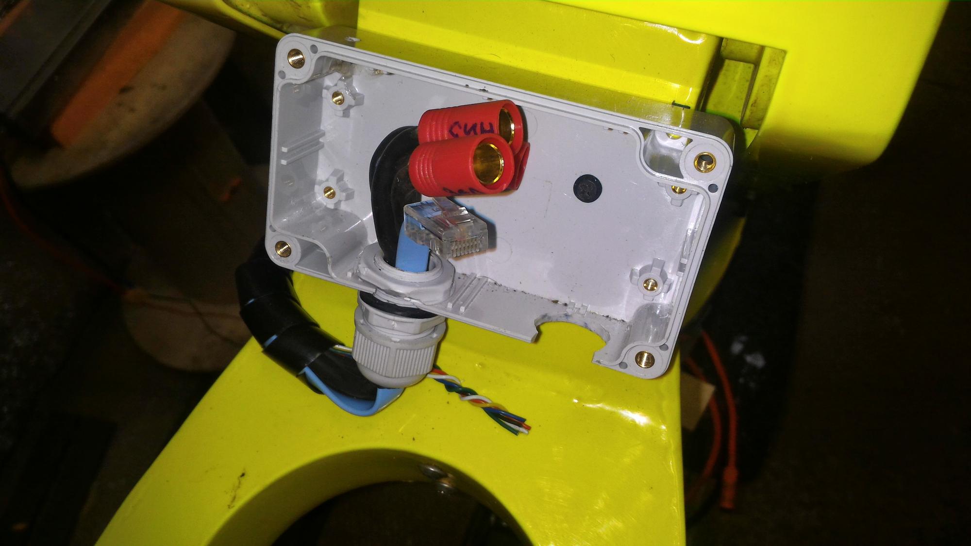 В верхней плоскости рамы, возле руля есть отверстие в которое вставляется уплотнительная муфта(очень большая), можно протащить все без паяльнинга, и выдавливания кишков из проводов крышками! А затянув получаем хороший ватерпруфинг и выглядит красиво.
