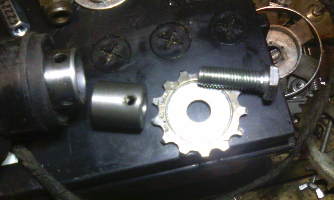 Ну да ладно. Хотел обойтись без токарки, но не обошлось. Выточил втулку к перфоратору, к которой крепится звёздочка. Втулка и проточка шляпки болта бесплатно, звёздочка 13 зубовая бесплатно. В шайбе звёздочки и втулке будет отверстие под штифт, дабы звёздочка не провернулась. Осталось выточить переходную втулку между моторчиком и редуктором.