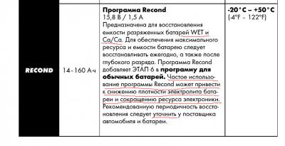 Предназначена для восстановления емкости разряженных батарей WET и Ca/Ca. Для обеспечения максимального ресурса и емкости батарею следует восстанавливать ежегодно, а также после глубокого разряда. Программа Recond добавляет ЭТАП6 в программу для обычных батарей. Частое использование программы Recond может привести к снижению плотности электролита батареи и сокращению ресурса электроники. Рекомендованную периодичность восстановления следует уточнить у поставщика автомобиля и батареи.