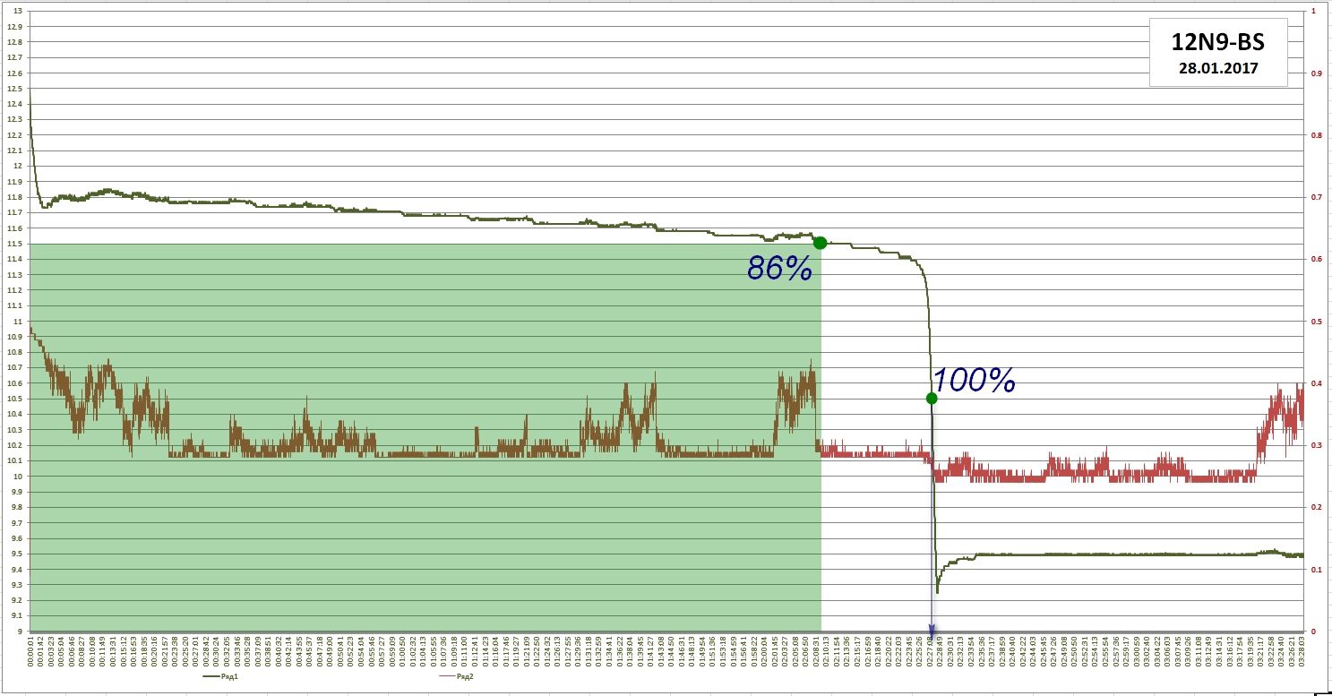 Если акб после 5лет службы 90% которых он провёл в УПС в буферном режиме, рассчитанная на 5лет срок службы способна отдать под нагрузкой 0,14С под кривой (до 12в) 70% энергии, то неужели новая акб не видевшая тяжести буферного  режима не сможет отдать 86% запаса энергии под нагрузкой в 0,1С? естественно при отсутствии дисбаланса по банкам.