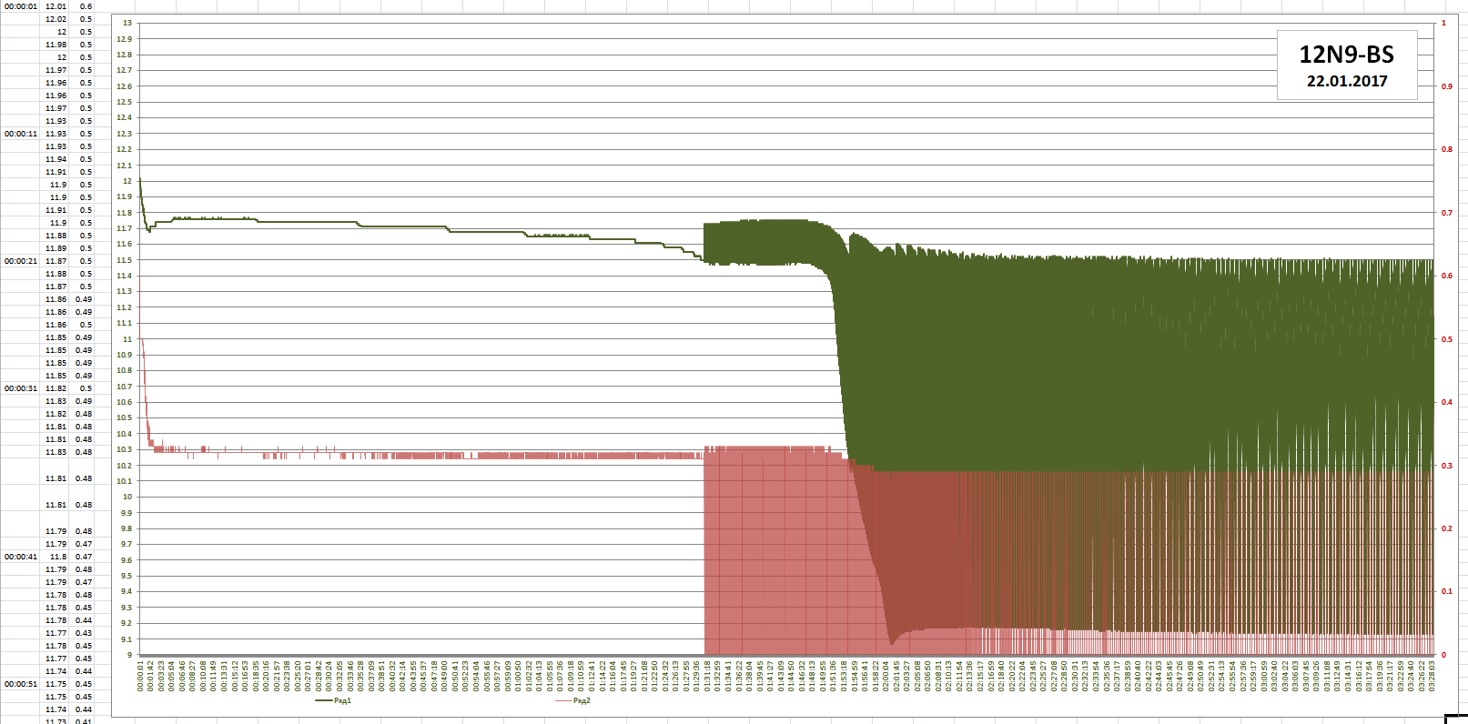 АКБ старый, в углу графика указаны его параметры и дата записи лога.