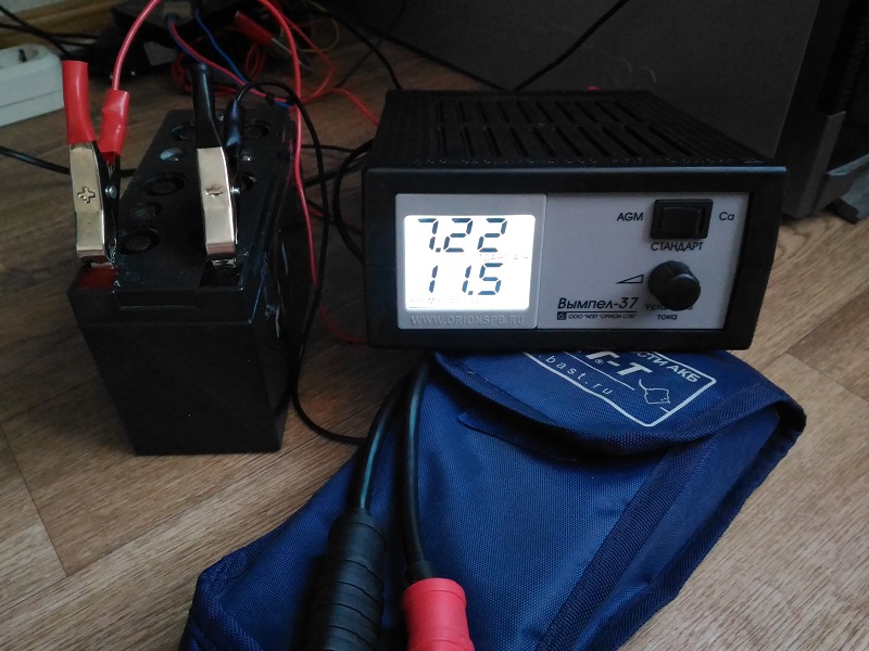 После очередного глубокого КТЦ, батарея была поставлена на заряд классическим способом, ЗУ Вымпел37 режим AGM напряжение 14-14,1в ток 0,9а. Время заряда, ёмкость напряжение и ток в конце заряда на фото. И практически сразу акб пришлось поставить на разряд не дожидаясь пока напряжение приобретёт постоянный характер, время кода сделано фото и когда начат тест у вас перед глазами, 10ч35минут акб ещё на зарядке, 10ч59минут уже на стенде. (это для тех кто верит, что чем раньше тем дольше  ;-D)