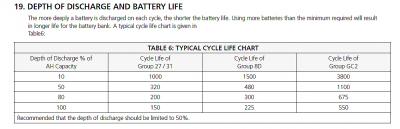 Страница 11, $19й, там сразу таблица жизненных циклов батарей в зависимости от глубины циклов разряда. Если учесть что 12 В- это 86% как вы принимаете для себя, то это разряд до 80%, и согласно статистическим данным, ваш АКБ прожил бы на четверть больше моего, разряжаемого до 100 %. Как то так  ;-)