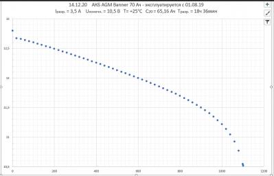 Держите для статистики график снятый с AGM Banner 70 Ач. В эксплуатации на авто с августа 2019 года. Ёмкость изначально была около 68 Ач. Сейчас слилось 65 Ач.