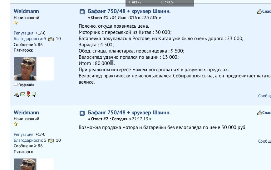 Правила https://electrotransport.ru/index.php?action=rules не запрещают такое обсуждение, цену я не обсуждал, сообщение информативное и далее по списку, в чем проблема? ЧСВ продавца? Или где-то расписана "жизнь по понятиям на форуме"?