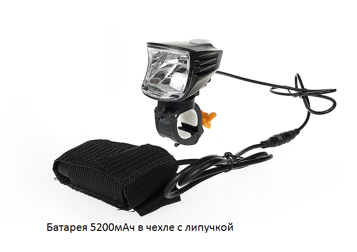 В комплекте фонарь 600Лм, металлический крепеж на руль, батарея 5200мАч, чехол для батареи, адаптер для зарядки.