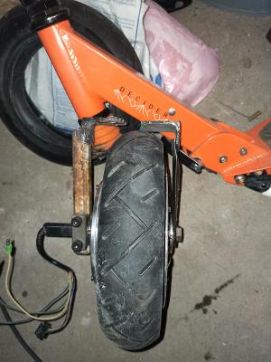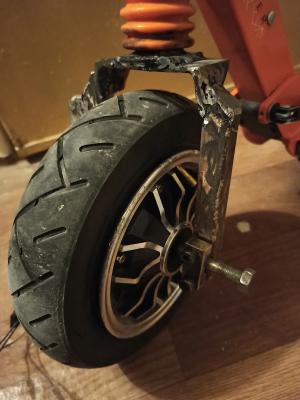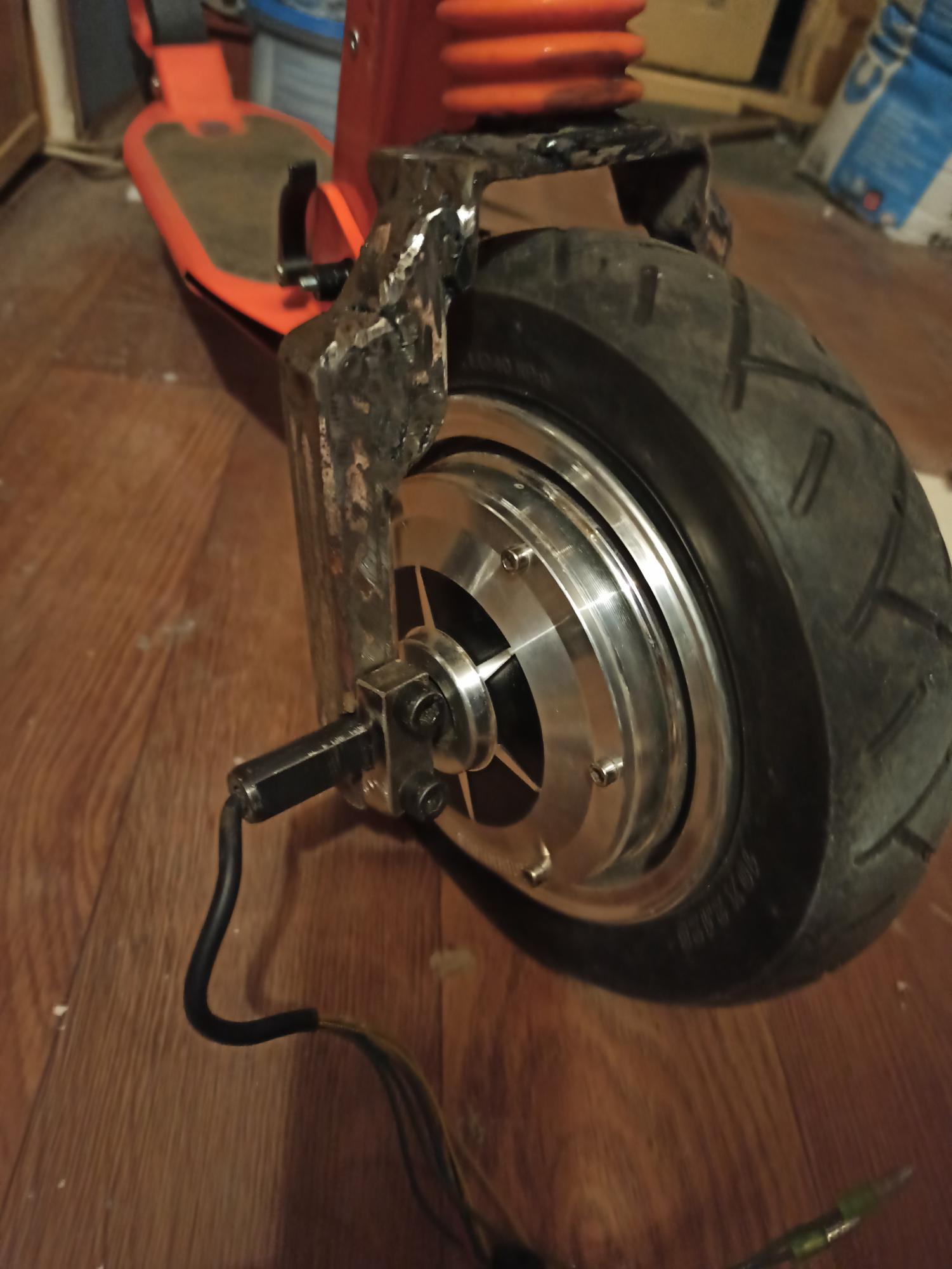 А вообще лучше не отращивать геморрой и купить готовое мотор колесо от Kugoo S3 или Xiaomi M365. Не надо будет вилку колхозить или двухстороннюю ось!