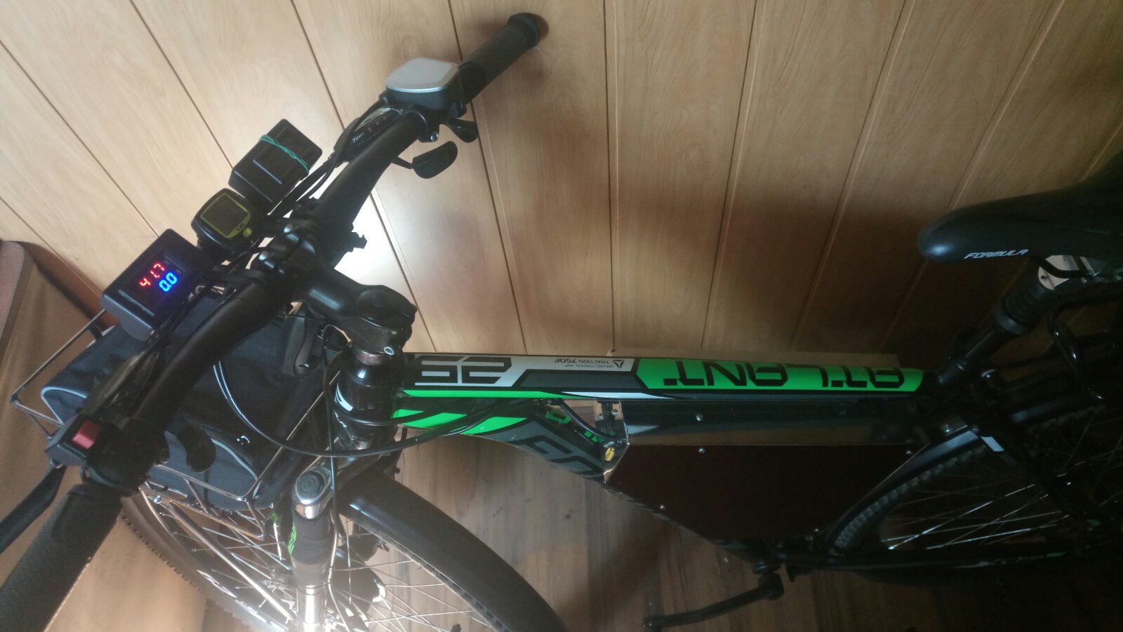 Полноприводный пепелац на базе CUBE Attention blackngreen 29''. Перед: MXUS MX01; зад: MXUS XF19 (GDR-19); 2 контроллера Mark I; батарея: 48 В, 20,8 А*ч, дисплей LCD8h, работает только с 1 двигателем. Max дальность: 110 км, max скорость: 52 км/ч.