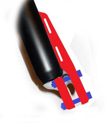 Нержавейный элемент - это не усилитель, просто кронштейн-накладка для крепления уса, усилитель той же геометрии, но толщиной 5 мм., скрыт под ней. Скажете, что КШМ? Нъет. Несмотря на то, что он даже не из 2, а из 3 частей. Там помимо того, что одно из соединений на 2 болтах, головка винта М8 и среднее звено упираются в перо, так что при монтаже все конструкция садится внатяг, провернуться-развинтиться у них не получится.  Гайки на всякий случай с фиксацией и под ними еще гроверы. Но будь вилка сплавная, еще бы и подварил по месту. Хомуты 2 шт. скрыты под наружным хомутом, фиксирующим внизу провод.