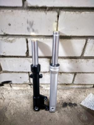 Передняя вилка у меня залипала а нижнем положении и на узких полицейских цеплялся ящиком для аккумулятора нижний. Тут писали что подходят перья от скутера Хонда Дио. Однако нужно колхозить переходник для тормоза и думать как крепить переднее крыло. В итоге были куплены перья для Хонда Дио гидравлические ( не усиленные ) они длиннее на 4 см и жёстче ситиковых. В итоге открутил внизу пера шестигранник вытащил сам амортизатор от Дио и прикрутил к стакану от ситика. В итоге клиренс передать на 4 см поднялся. В итоге общий клиренс стал 17 см , лежачих полицейских и мелкие бордюры вдвоем проходит на ура. А главное не надо придумывать переходник для крепления тормоза и крыло как полное. Да и цвет амортизаторов в цвет остался !!!