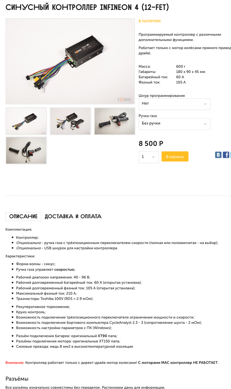 вот этот как на картинке. У меня такие, ещё у Timmy 1 такой же. Если купить ещё шнур программирования у нему , можно менять параметры ток батареи, фазный ток, рекуперация и тд... Только под него батарея нужна из высокотоковых ячеек. Родная не выдержит, может  испротится или даже сгореть ....да там есть режим ещё 120% (за счёт опережения угла зажигания ) если поставить трёх позиционный переключатель скорости. На нем у меня на батареи 72в на вывешенном колесе 118 кмвч показывает без него 87 кмвч . Имхо классная вещь. При подключении фазы по цветам не совпадут скорее всего , нужно потратить время на подбор ( не проблема считаю). Разъемы в этом же магазине откуда у вас картинка для подключения фаз лучше купить xt150 а так же на батарейке поменять разъем на xt90. Воьшем из доступных считаю очень хороший. Есть лучше но и дороже. Считаю больше 12 Фет (именно для инфенеон) для нашего МК 2 кВт больше не стоит брать , ибо наш МК может не выдержать больше 60а батарейного ....
