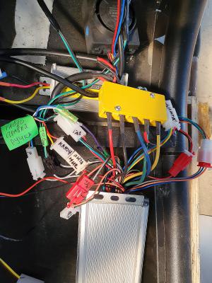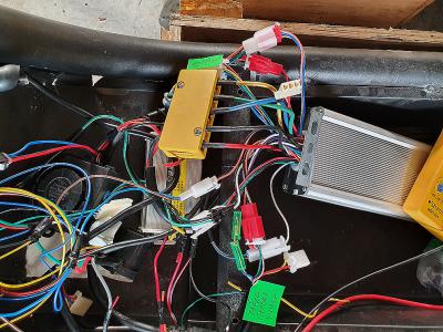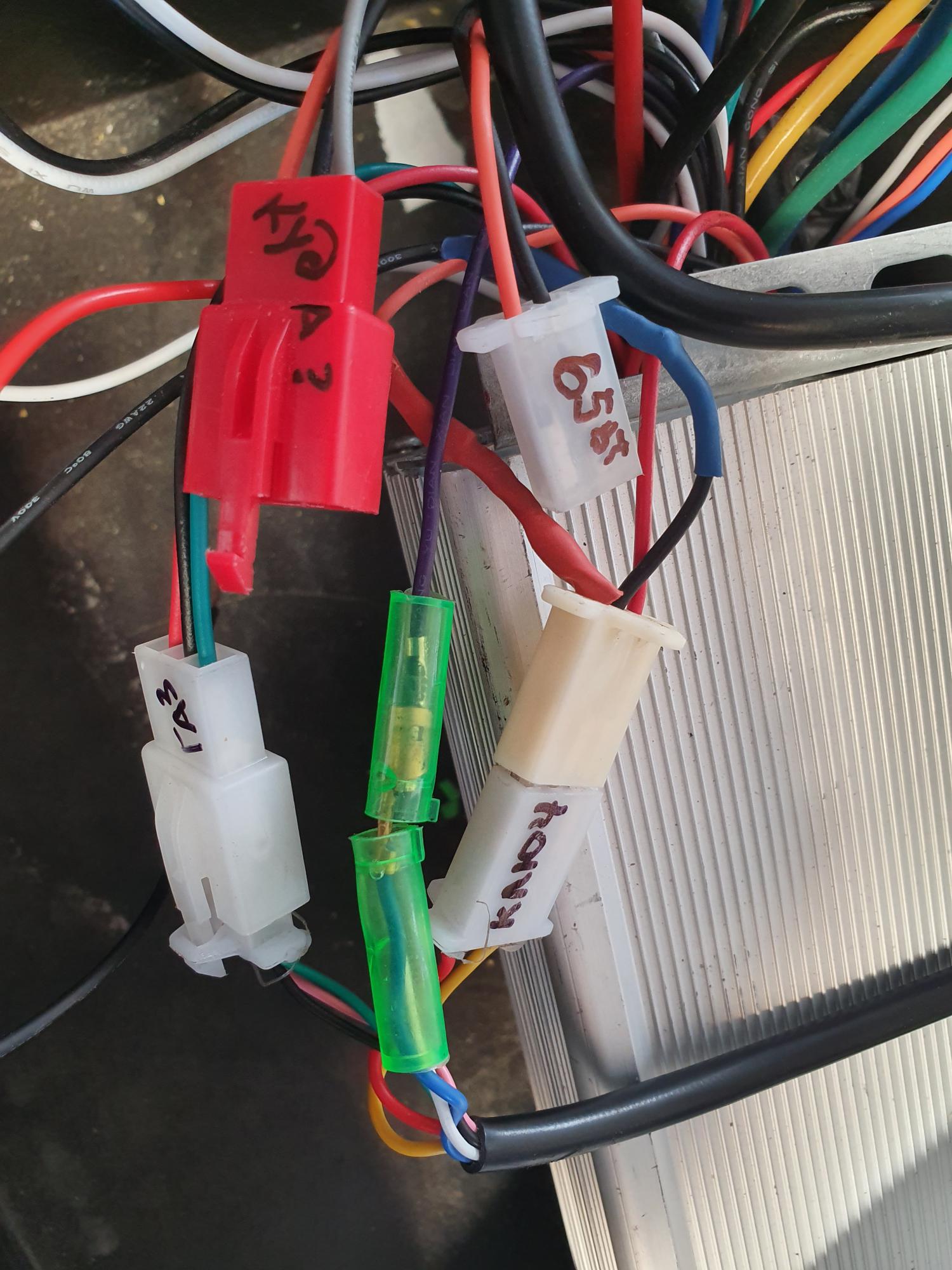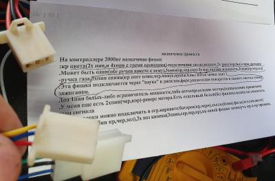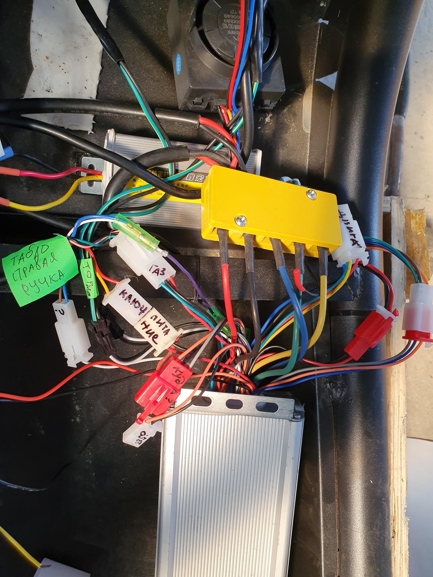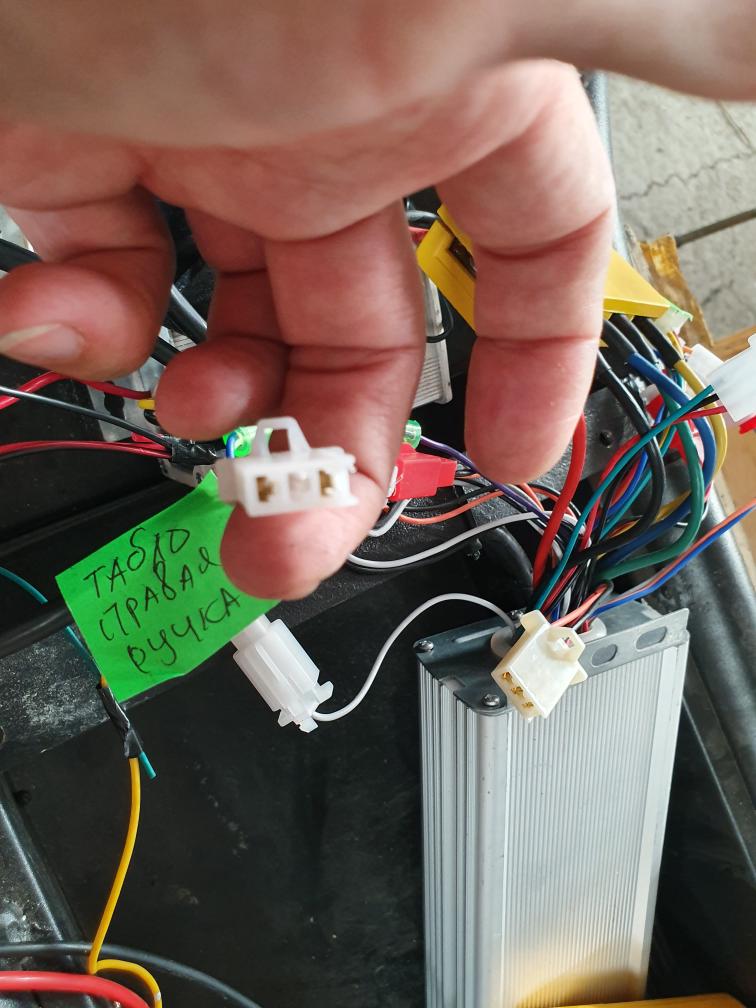 просьба не пинать  сильно))) вопрос наверное уже был.  Схема подключения интересует. получил сегодня контроллер2000. снял старый1500. методом вынул клему ,переставил на другой контроллер в такую же. короче включил батарею сразу пшшшш и загорается проводка, идущая к левой ручке. а именно красный+ и чёрный-. понятно ,что коротыш. но у меня уже в глазах рябит от этих проводочков. Вот и пишу сюда с просьбой о схеме или ссылки на подобное обсуждение. Правая часть с табло молчит не светится,движок тоже. один тройник на зад идущий,остался без мамы.на старом подключении были скрутки 3штуки. всё пометил.пробовал прозванивать тоже не получается.хуже всего что я не понимаю что за провода выходят из контроллера и их назначение. что за коробочка на фото?