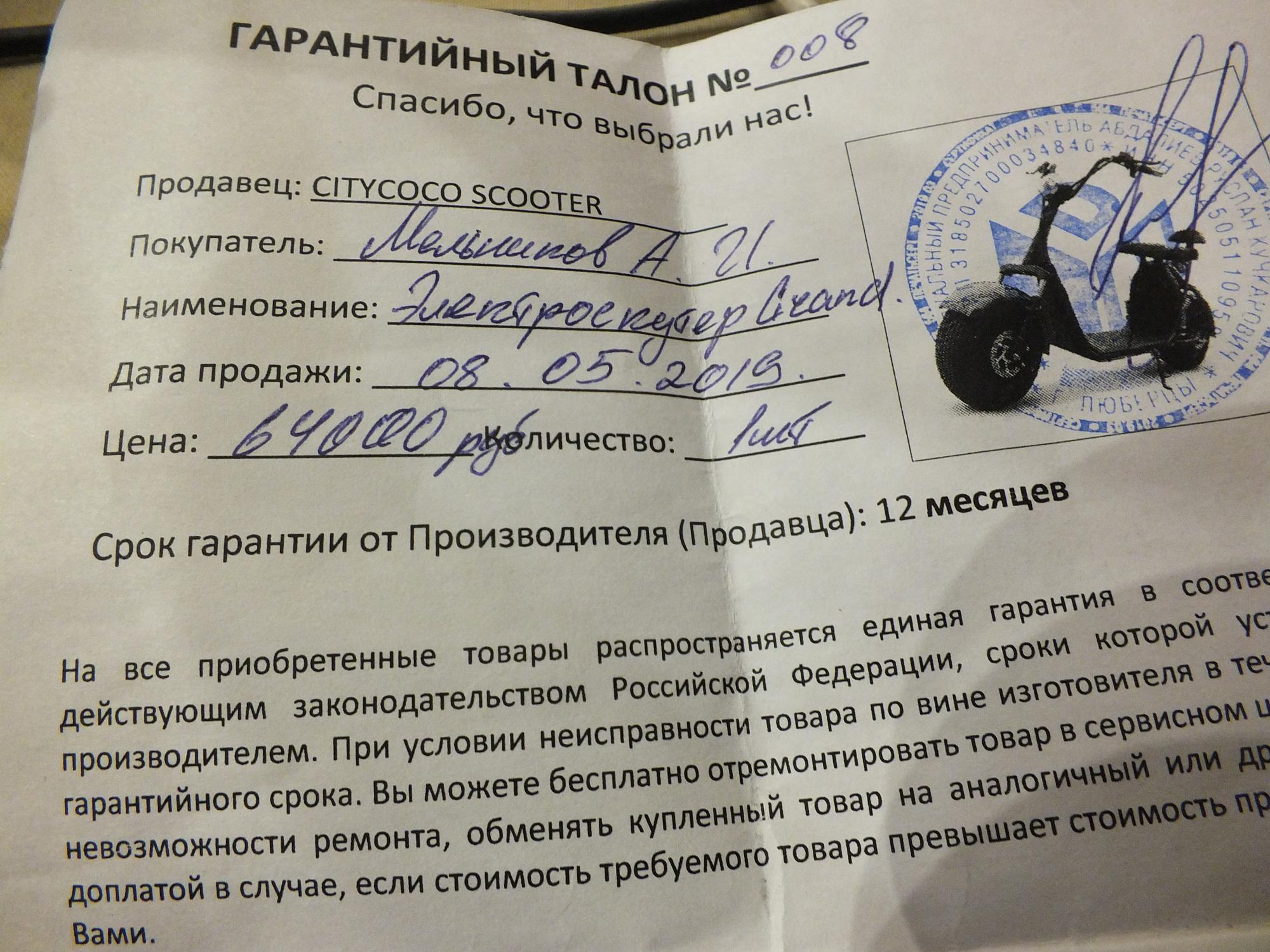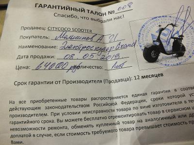 Стал пытаться разобраться с тем что я собственно купил и очень удивился.Потому что в документах в гарантийном талоне нет названия Сити Коко .вообще нет.Написано Электроскутер Crand .само описание от не пойми чего и весьма странное .
