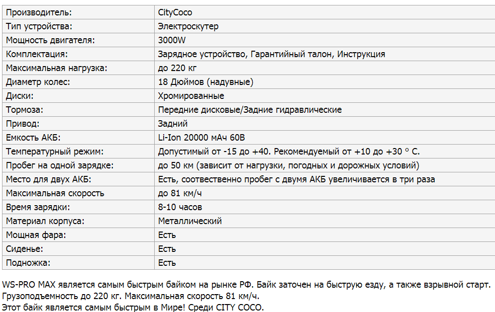 ✔**WS-PRO MAX* *является самым быстрым байком на рынке РФ. Байк заточен на быструю езду, а также взрывной старт. Грузоподъемность до 220кг. Максимальная скорость 81км/ч.