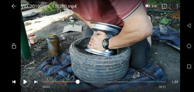 Ложу покрышку на землю диск вдавливаю-вворачиваю в покрышку на сколько могу, потом лопаткой смазанной салидолом или циатином добортовываю. Переворачиваю колесо коленками насаживаю покрышку на диск, поправляю корд, рукой придерживаю край корда который на изломе, лопаткой добортовываю. Все. Для чего лопатку мазать салидолом? Так она легче скользит по резине.