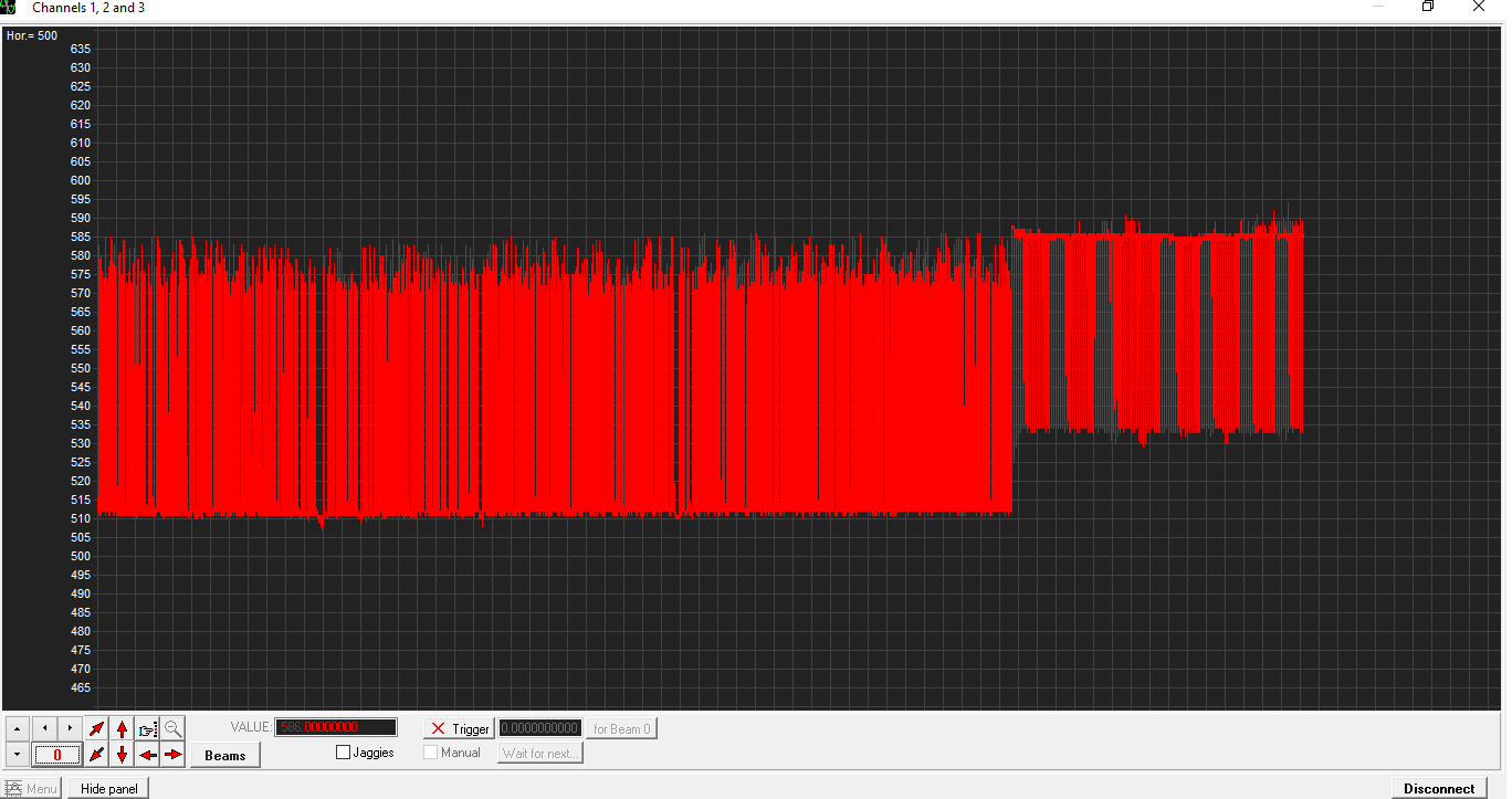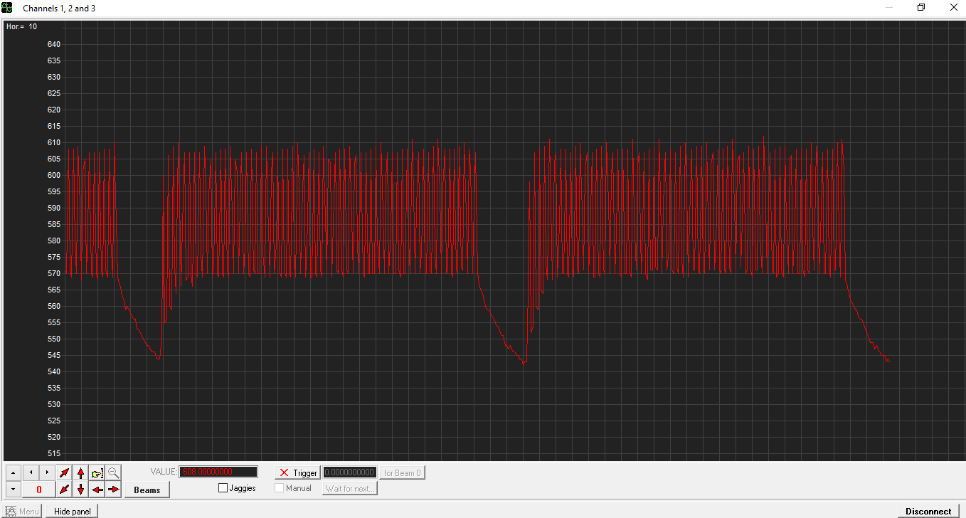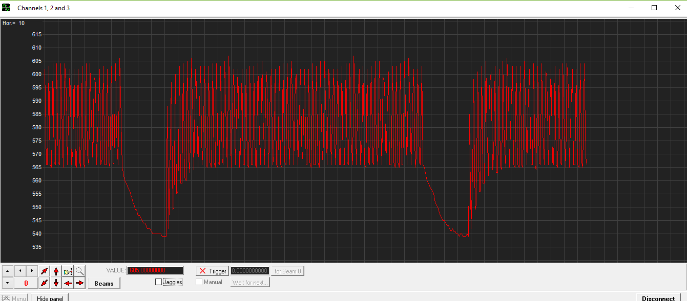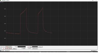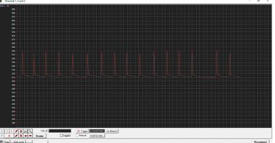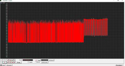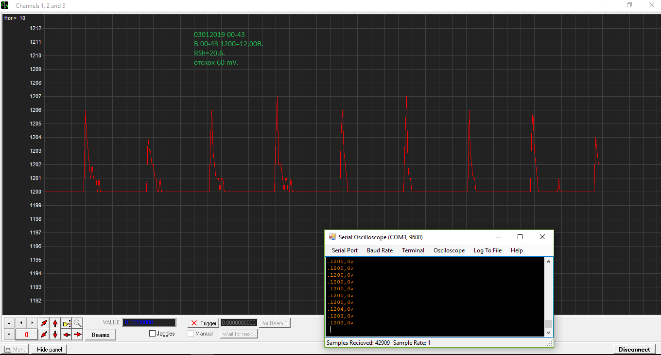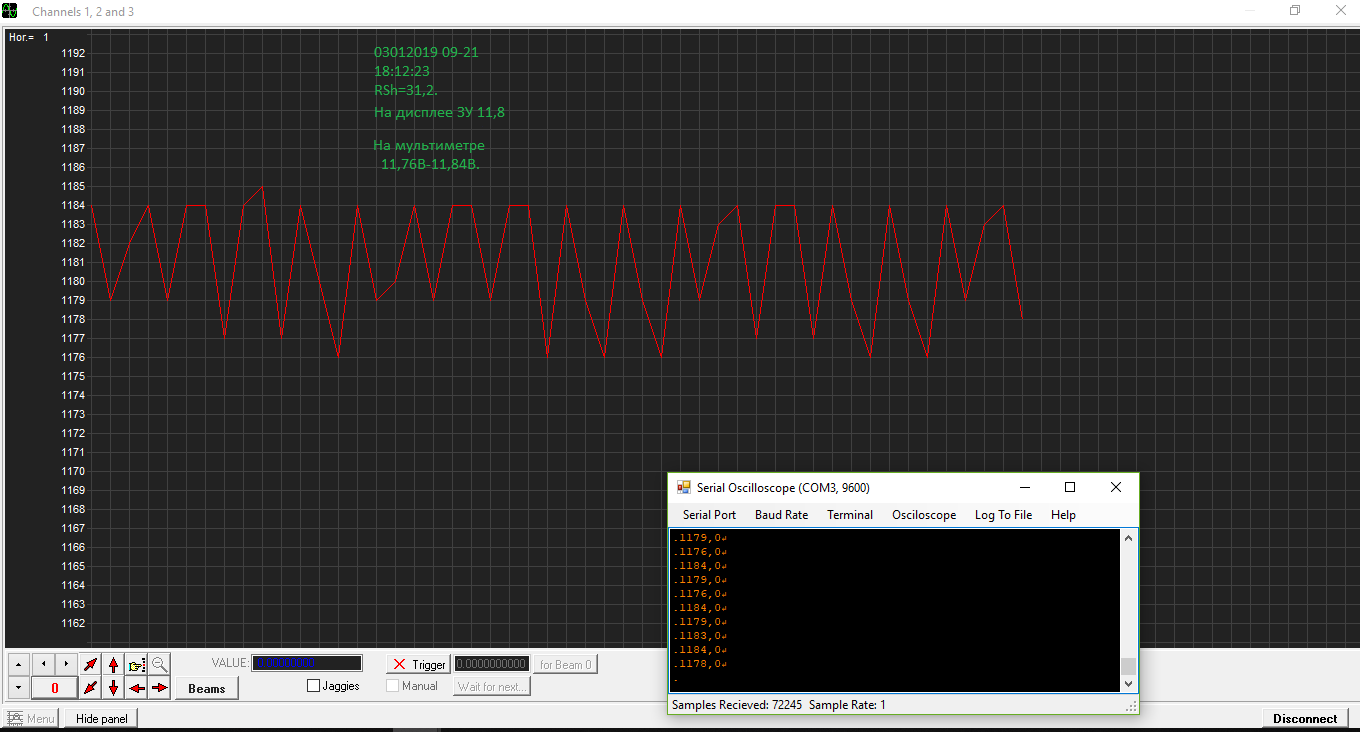 30102018, примерно в 17-30 местного времени, выключил ЗУ и снова включил. В компьютере, в терминале ввел 500 ( 0,5 секунды ), пошла запись. Вышел из терминала, вошел в осциллоскоп,  выбрал порт, выбрал baud rate, заработало, теперь пошла более детальная запись: