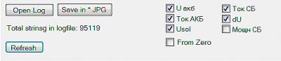 Чекбоксы рисуемых графов - переименовываемые по клику мышки. Говорят отображать ли параметр лога линией на графике. Название и состояние каждого чекбокса сохраняются при выходе из программы.
