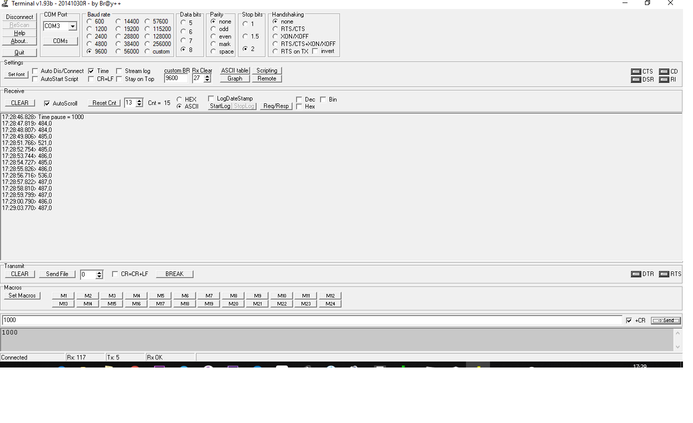 Пробовал делать ресет заземлением 1 ноги МК на минусовой полигон платы-в окне/блоке приема программы Terminal v1,93b появились такие несуразные сообщения, при этом в самой нижней строке окна появилось уведомление Rx OK.