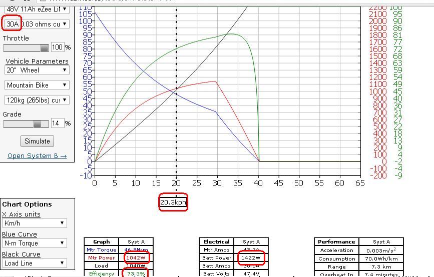 На своих самых первоначальных 36В и 15А я бы полз в 14% уклон на 6 км/час ( в 3 раза медленнее) и на нагрев шло бы  280Вт. Сейчас на 48В и 18А иду на 11,5км/час (терпимо) и нагревом 360Вт. Если перейду на 48В и 30А будет 21км/час с нагревом 380Вт (мелочь для такой скорости).