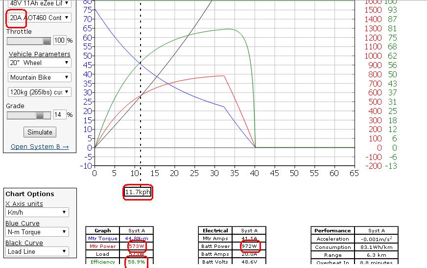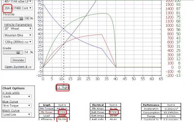 Я убедился что есть смысл эксперементировать с напряжением и с переходом на 48В получил почти 10% прироста КПД и более чем в полтора раза большую скорость на 14% уклоне, и вот буквально  сегодня понял что для моего двигателя 18А это ошибка, даже 20А гораздо хуже по всем показателям чем 30А.